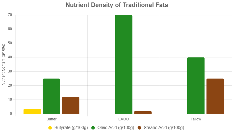 • Butter / EVOO / Tallow: Ancestral fats with unique profiles—butter offers butyrate for gut health and vitamins A, D, K2; EVOO provides oleic acid and polyphenols for antioxidant protection; tallow delivers stearic acid for heat-stable cooking and prolonged satiety.